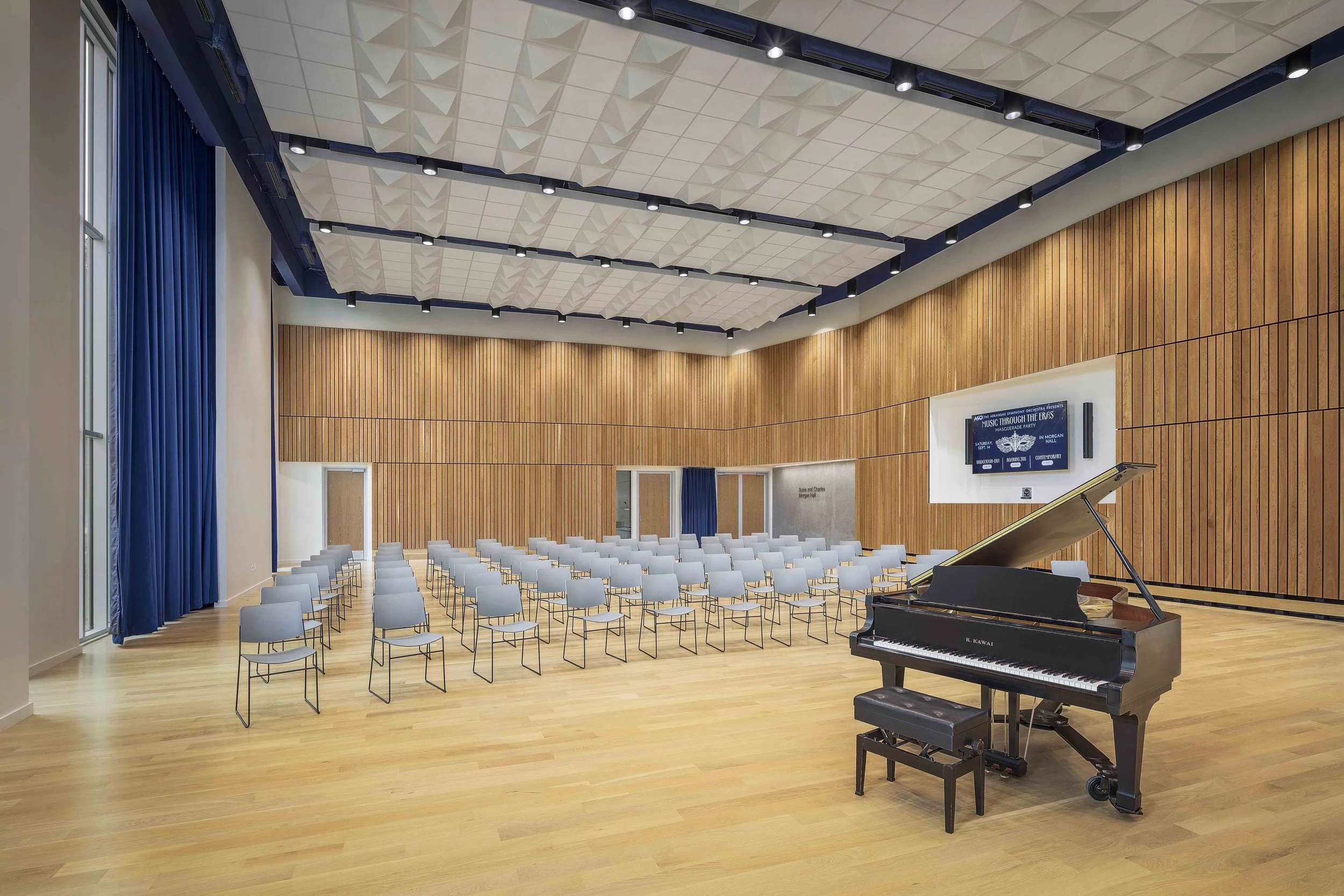 The new music center is a radically-welcoming hub of musical activity for all Arkansans, serving youth and adults of all ages with an array of musical offerings. The building provides access to music education, music performances, and music making to residents of all corners of the state through new spaces and a broadcast and recording studio. The new music center boasts contemporary features for children and adults that participate in programs, including music classrooms and practice spaces, ensuring a conducive environment for musical growth and creativity. The space includes Morgan Hall, which serves as a versatile space for rehearsals and concerts, fostering an immersive musical experience.